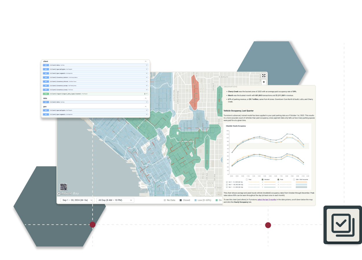 Turnstone can aggregate and process any structured data. Whether it’s XLSX, CSV, XML, JSON, GEOJSON, or any other custom format specific to your operation, our modeling engine ensures you have a cohesive and usable data set. All in an API format that’s compliant with the OMF Curb Data Specification.